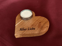 Handgearbeitetes Herz aus Kirschholz, fein geschliffen und geölt; mit Teelichthalter aus Edelstahl; Lasergravur "Alles Liebe" für alle gängigen Teelichte geeignet; Lieferung mit paraffinfreiem Ökoteelicht; ca. 11 x 10,5 x 1,7 cm.